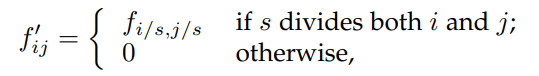 즉 s가 i,j 의 공약수가 되면 filter의 가중치를 살리고, 그렇지 않은 경우에는 0으로 만든다. 모든 i, j에 대해서 실행하게 되면, i,j 가 모두 s로 나눠지는 경우는 원래 fi,j의 값을 갖게 되고, 그렇지 않은 경우는 0이되며 필터의 크기가 굉장히 커지게 된다.