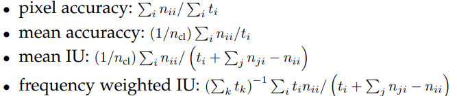 Augmentation: 각 방향에서 최대 32pixel(예측의 가장 coarse한 스케일)로 이미지를 변환해, 무작위로 mirroring하고, jittering하여 훈련데이터를 보강하려고 시도하였으나 눈에 띄는 개선을 가져오지 못했다.