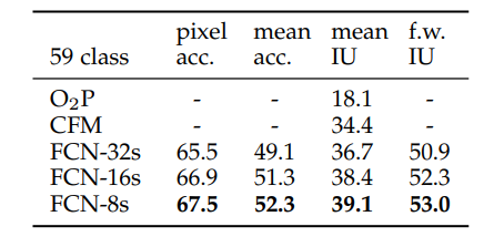 FCN-16의 validation score이 mean IU 65.0으로 향상되고 FCN-8s는 아주 작은 65.5의 향상을 이루어냈다. 따라서 효과의 감소시점을 만났기 때문에 추가적인 shallower layer에대한 fusing은 진행하지 않았다.