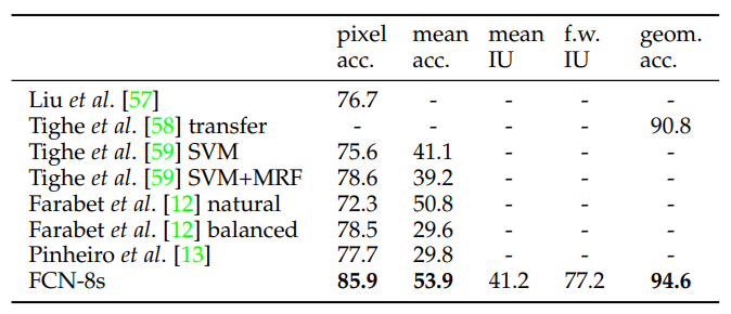 classification 에서 segmentation으로의 fine-tuning은 각 net에 대해 괜찮은 예측값을 내게 하였다. 가장 성능이 안좋은 모델의 경우에도 best performance의 75%가량을 달성하였다. FCN-VGG16이 56.0 mean IU로 가장 좋은 성과를 냈고, 이러한 FCN-VGG16을 베이스 네트워크로 사용하였다.