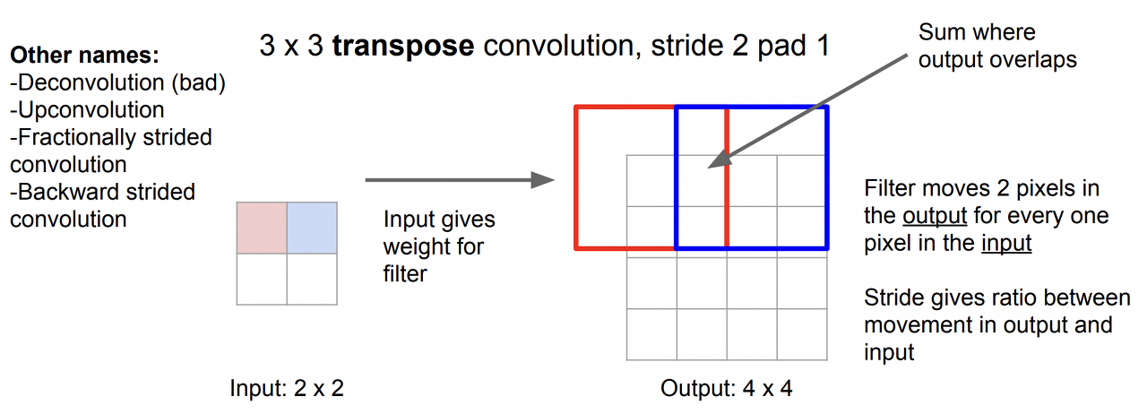 이 과정을 반대로 생각해 보면 아래 그림과 같다. 논문에서는 이를 Deconvolution이라고 정의하는데, 현재는 transpose convolution이라고 불리는 과정으로, 2x2의 인풋이 주어지면, 인풋의 한 node를 이용해 3x3 filter(필터 내 가중치는 학습되는 파라미터)에 weight를 시켜준다. 예를 들면 input 2x2의 왼쪽 위의 빨간 부분이 2이고 3x3 에 모두 weight가 2로 되어있는 필터를 적용하면, output은 3x3의 4들로 구성되게 된다. 이러한 결과를 padding 된 output map에, stride만큼 이동하면서 삽입하고, 겹치는 부분의 경우 두 결과값을 더하는 방식으로 transpose convolution을 진행한다. 이름에 transpose convolution이라는 명칭이 붙는 이유는 아이디어 구현 과정에서 행렬의 Transpose를 사용하기 때문이다.