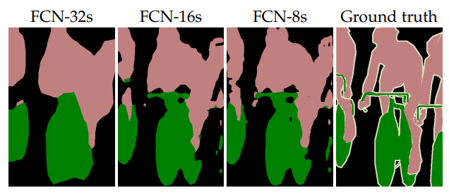 Fully convolution화된 classifier가 semantic segmentation(인식 및 지역화)을 위해 fine-tuned 되면서, 이러한 네트워크들은 더 shallow하고 local한 feature들에도 바로 사용이 가능하게 개선되었다. 비록 이러한 base network들이 standard metrics(IoU등의 평가지표)에 대해 높은 성과를 보이지만, output의 경우 매우 거칠다(coarse). network prediction에서 stride를 사용하는 것이 upsampled된 output에 제약을 가하는 것이다. 아래 그림을 보면 upsampling 과정에서 stride 크기를 32로 설정한 일반 FCN-32s(FCN-VGG16)의 경우 segmentation 단위가 둥글고 크다(coarse하다)는걸 확인할 수 있다.