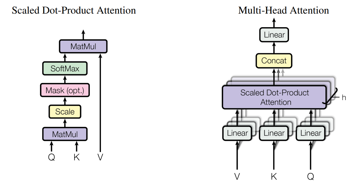 논문에서는 그림 왼쪽과 같은 구조를 Scaled Dot-Product Attention이라고 부른다. 먼저 인풋값으로 query (I am a boy에서 I)와, 모든 key 값 (I, am, a, boy) 과의 내적을 구한 뒤, 얻어진 벡터에 대해 key의 dimension dk(이 경우 I, am, a, boy 이므로 dk = 4)의 1/2승값인 sqrt(dk)로 나누어 Scaling 해 준다. 그런 뒤, 이 값을 softmax 함수를 거쳐 value 벡터에 적용될 가중치 값을 얻어낸다.