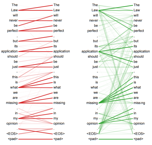 추가적인 장점으로는 self-attention이 더 이해 가능한 모델을 만든다는 것이다. 아래 그림을 살펴보면, 각각의 attention헤드가 다른 Task에 대해서 수행하는 방법을 배울 뿐 만 아니라, 많은 경우 문장의 의미론적, 문법적인 구조를 반영하는 것을 보인다.