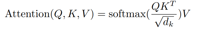 실제 사용시에는 이러한 attention function을 하나의 query 벡터 단위로 연산하는 것이 아닌, 여러 query들을 통합한 행렬 Q를 사용해서 연산을 진행한다. 마찬가지로 key와 value도 벡터 단위가 아닌, 행렬 단위인 K와 V단위로 사용된다. 이러한 연산을 행렬식으로 정리하면 아래와 같다.