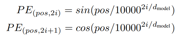 pos 의 경우 위치, i는 차원을 의미한다. 즉 positional encoding의 각 차원이 sine파에 상응하게 되는 것이다. 파장은 2pi 부터 10000 x 2pi까지 (i 에 따라) 달라지게된다. 논문에서는 차원을 k로 고정하게 되면, PEpos+k가 PEpos에 대한 linear function으로 표현될 수 있기 때문에, 모델이 상대적인 위치를 쉽게 학습할 수 있다고 가정했기 때문에, 이 함수를 사용했다고 한다.
