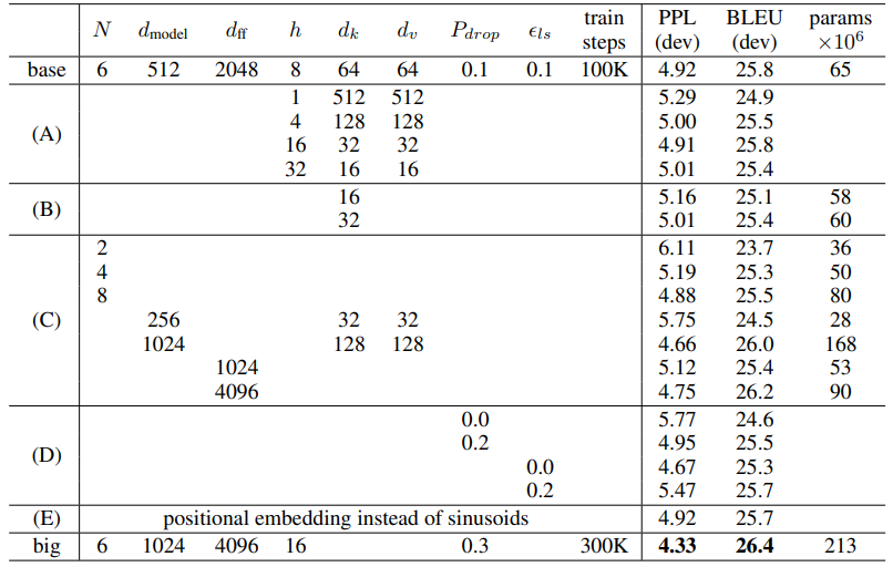또한 positional encoding 대신에 positional embedding을 학습하는 방법에 대한 실험을 진행했는데, 위의 함수를 사용한 것과 거의 동일한 결과를 낳았다고 한다. 아래 테이블의 (E)를 살펴보면, positional embedding을 사용하였을 때, 가장 위쪽 row인 base 와 비교하였을 때, 성능에 큰 차이가 없음을 보여준다. 이에, 논문에서는 sine파 버전을 선택했는데, 학습 때 보지 못한 더 긴 시퀀스를 넣었을 때도, 적용될 수 있다고 생각하였기 때문이다.