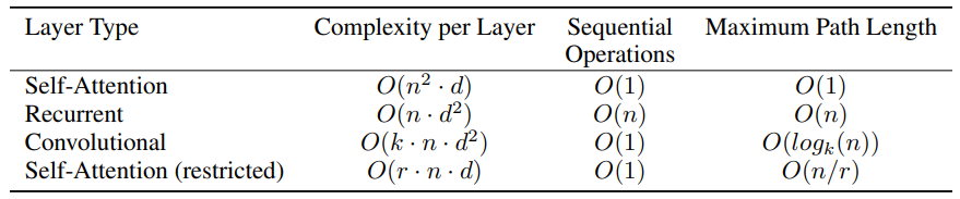 즉 input과 output의 시퀀스의 조합에서의 길이가 짧아질 수록 더 쉽게 long-range dependencies를 학습할 수 있으므로, 논문에서는 네트워크 안의 서로 다른 layer 타입으로 구성된 두 개의 input과 output 위치에 대한 maximum path length를 비교할 수 있는 factor로 책정하였다.