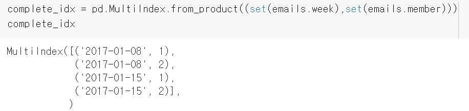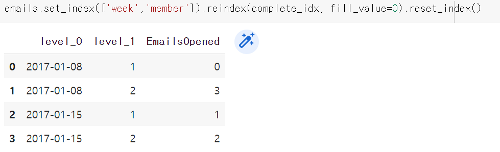 all_email = emails.set_index(['week','member']).reindex(complete_idx, fill_value=0).reset_index()