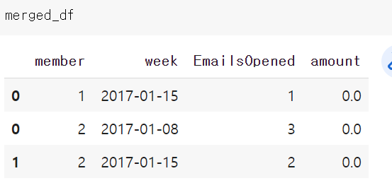 merged_df = pd.DataFrame(data=[],columns = ['member','week','EmailsOpened','amount'])