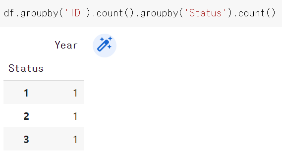 이를 위해 저자는 다음과 같은 python 코드를 이용해 먼저 맴버ID 기준 year와 status의 개수를 count() 한 뒤, 다시 status 기준으로 묶고 count 하는 방식으로 각 맴버가 하나의 Year 기준으로 되어 있는지를 확인한다.