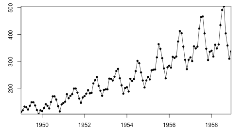 아래 데이터 셋의 경우 시간의 경과에 따라 평균과 분산이 증가함을 확인할 수 있다. 추가로 계절성 또한 가지는데 이 또한 정상성에 반대되는 것.