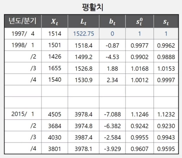 - 처음에 initializing이 필요하며, 계절성 지수는 평균이 1이 되어야 한다.