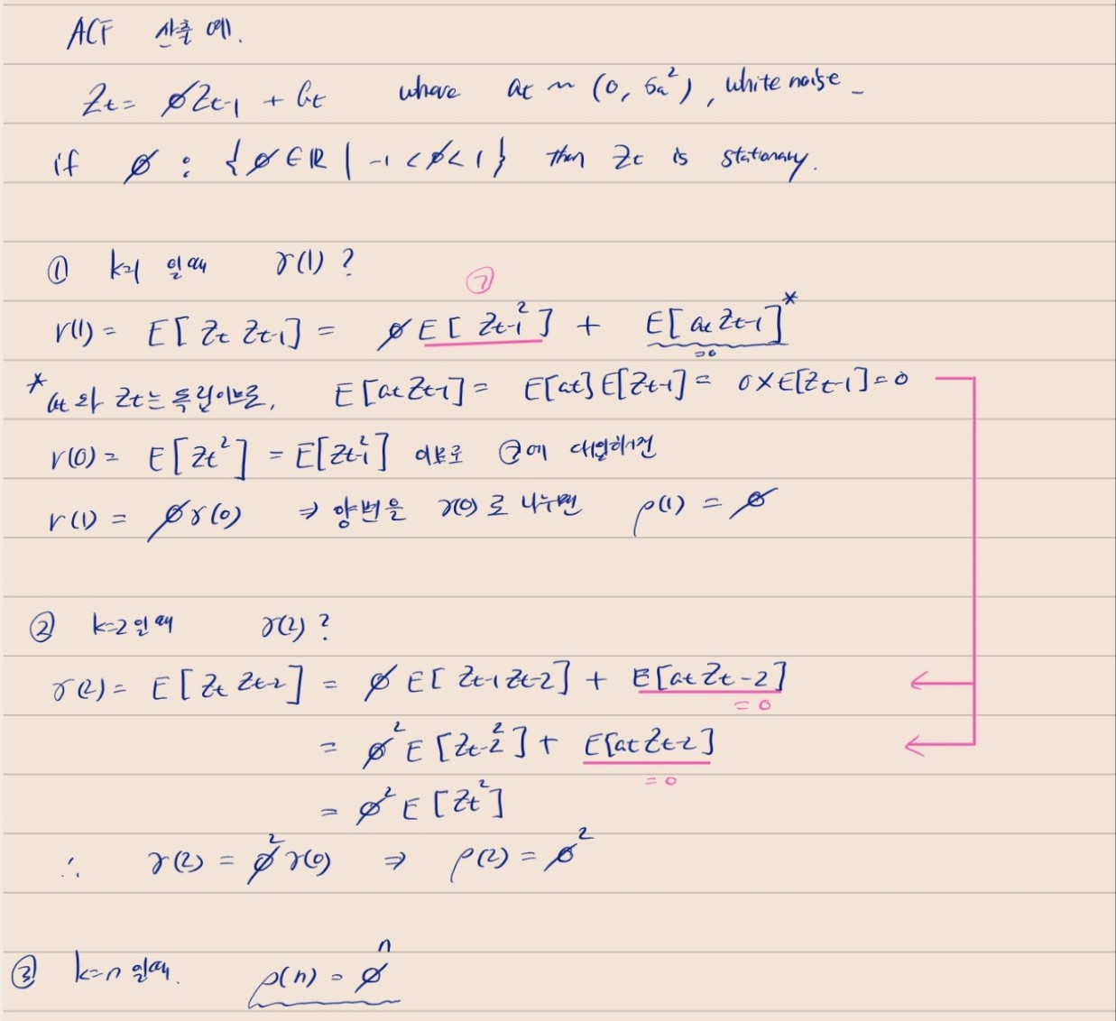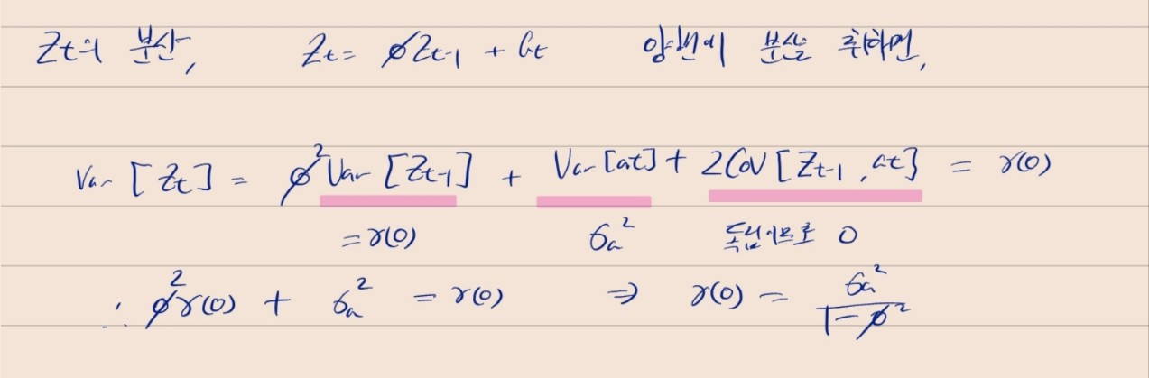 - 공분산의 정의에 따라 $Z_t, Z_{t-k}$에서 각각의 평균을 빼나, 약 정상성 가정(기대치가 시간에 따라 일정)에 따라 동일한 평균을 빼는 방식으로 구할 수 있다.