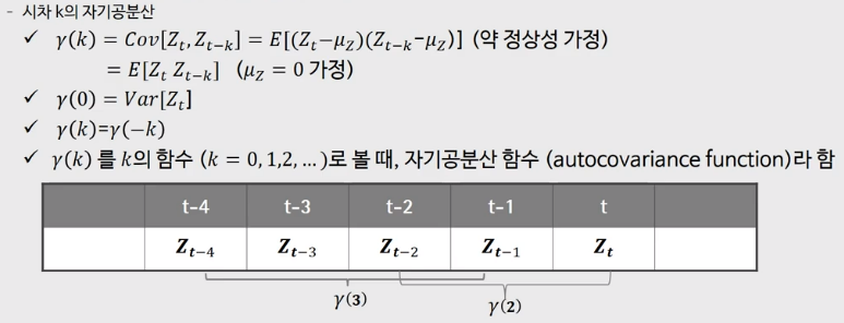 - 시계열의 시간에 따른 연관 패턴을 자기공분산으로 요약
