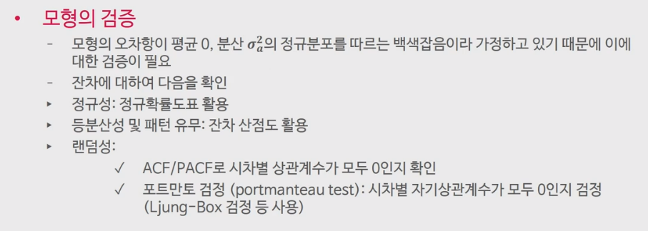가장 처음 시점에 $a_t$들이 백색잡음이라고 가정했으므로 이에대한 정규성과 등분산성에 대한 검증이 필요하다.