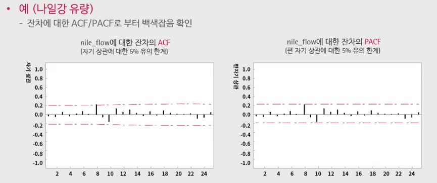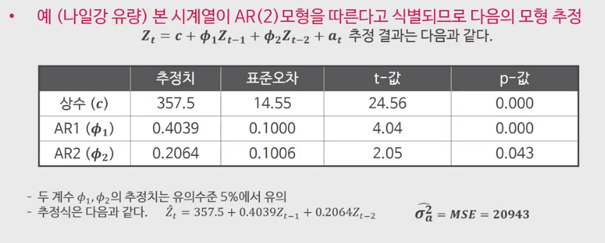 단계 5:의 과정을 거쳐 AR(2) 모형이 나일강 유량 데이터에 적합함을 결론지을 수 있다.