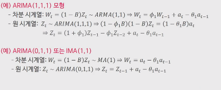 차분된 시계열이 ARMA(p,q)를 따를 때, 원 시계열 Zt를 ARIMA(p,d,q)모형을 따른다고 얘기할 수 있다.