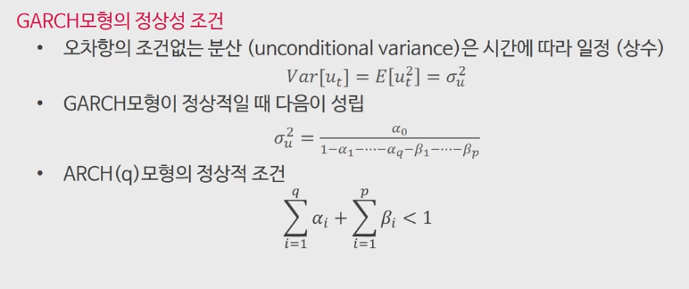 ARCH모형과 동일한 방식으로 두번째 식을 유도할 수 있고, 마찬가지로 분산이 0보다 커야 하기 때문에 정상성 조건이 위와 같은 형태로 나타난다고 한다.